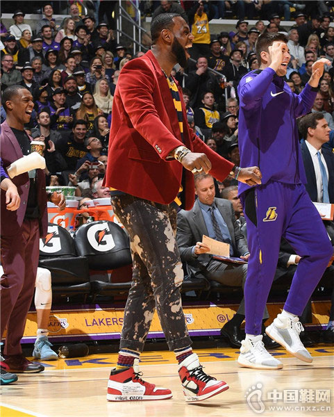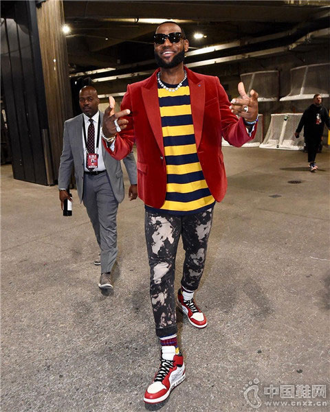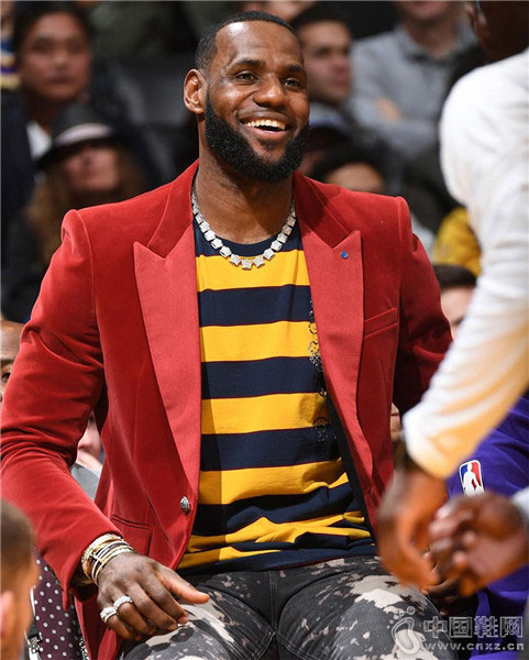 詹姆斯以红色西装出镜,虽然没有上场机会,但他当天的心情不错。
