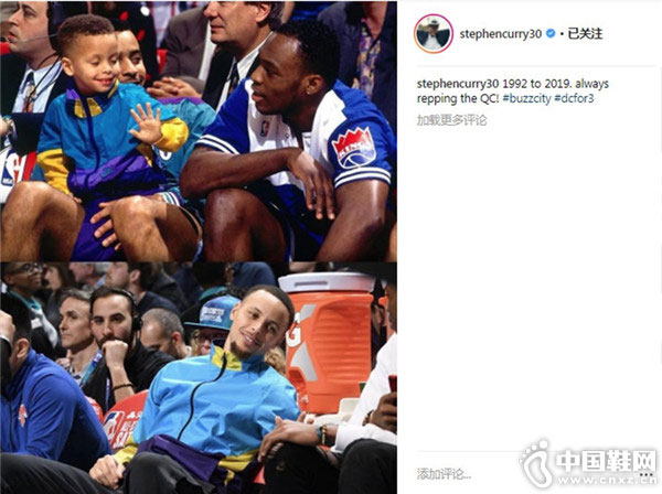 而今日库里现身场边观看比赛也上身了同样装扮的夹克外套,并在个人 ins 上附言 “1992 to 2019”,溢出满满的回忆。