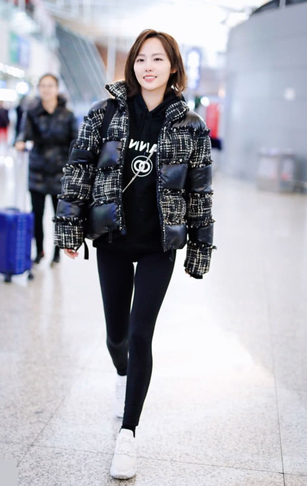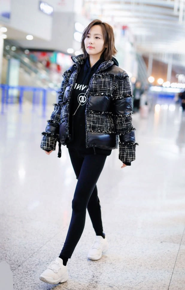 张嘉倪身穿一件黑色的紧身裤,腿部线条很好看,散发出无限魅力,还有几分时尚感。搭配一双黑色的袜子,看起来腿部更长。穿小白鞋是落伍的行为,看她的“棉花鞋”吧!