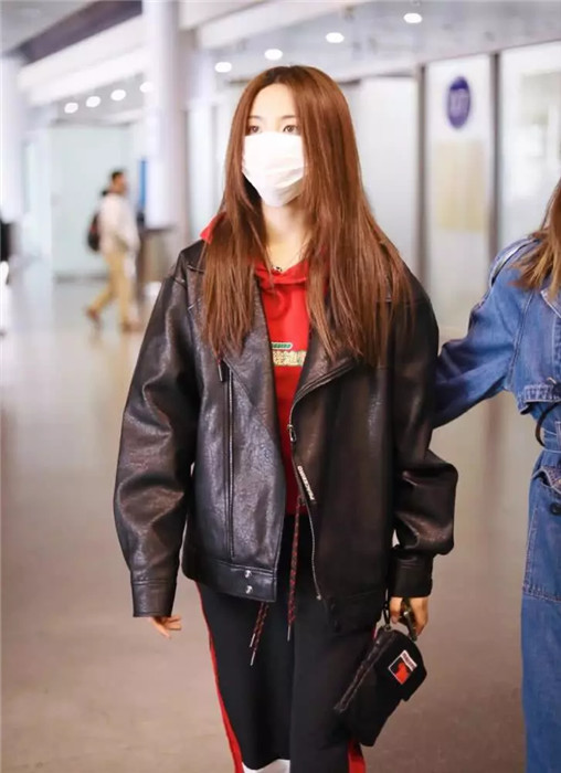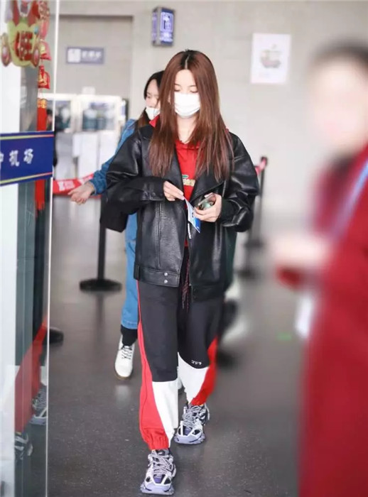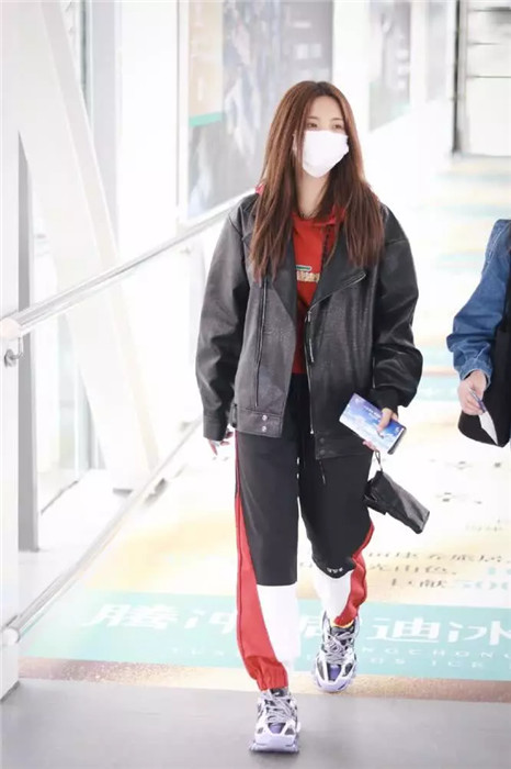 这张机场私服,走的是运动风系列,我们可以看到上身是红色的连帽卫衣,这个红色非常的显白,下半身是黑色,白色和红色的撞色拼接的运动裤,这条运动裤其实非常的修身,可以掩盖腿部的一些缺陷。