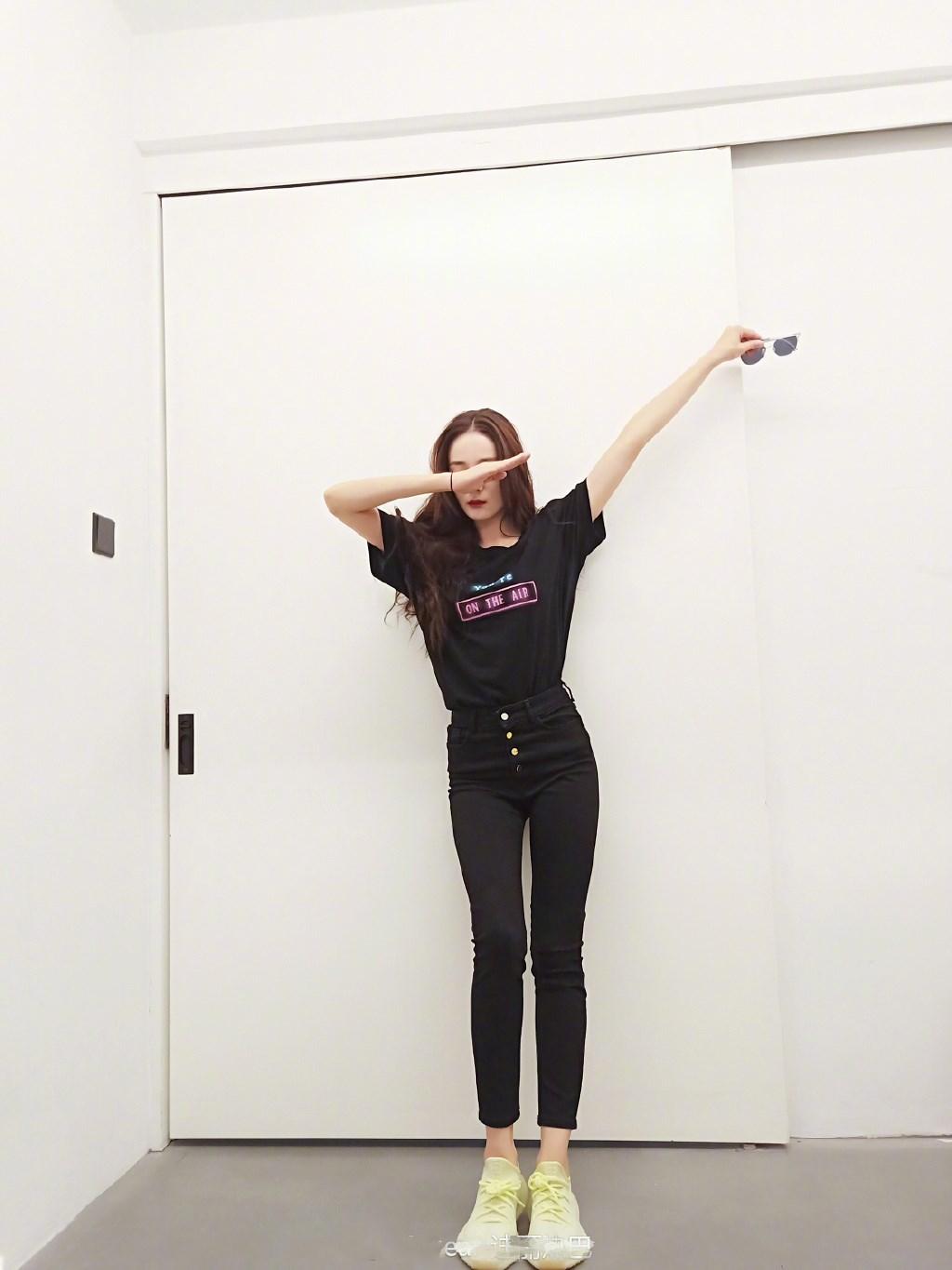 热巴的身材本来就很好,不仅是身材比例,身材线条也很好看。热巴身穿Saint Laurent的黑色字母T恤,搭配Zara的黑色高腰牛仔裤。不得不说Zara这个快时尚品牌真的得到好多明星的青睐,不贵的价格在明星穿出来就像奢侈品一样,总觉得是很贵的衣服。