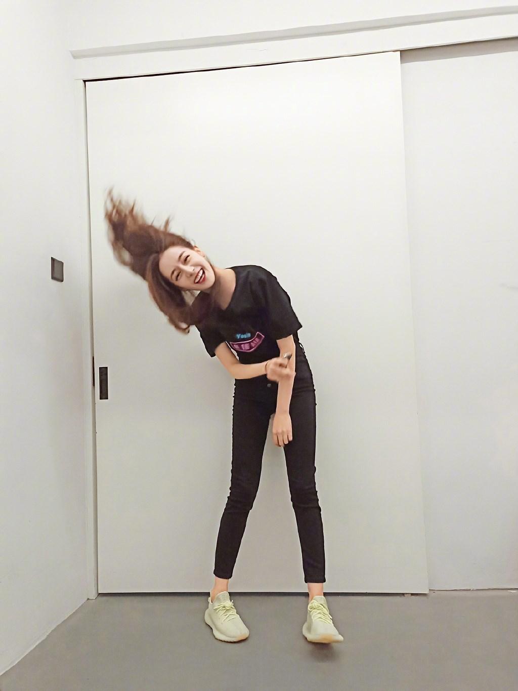 高腰的裤子提高腰部线条,拉伸腿部,黑色又显瘦,是大长腿无疑了。adidasi Yeezy Boost 350 V2系列的黄油椰子鞋是这一身黑中的亮点了,清爽的颜色配上黑色,再加上热巴做的dab的动作,这是耍酷中的带点小清新呀。