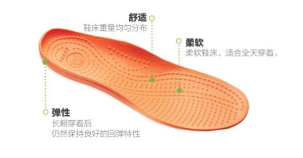 Crocs穿着舒适的原因除了使用的轻质缓冲材料,还有就是一些人性化的设计:如透气孔使得空气流通、保持脚部干爽、防滑的鞋底、材料进行了抗菌处理、易保存等等。
