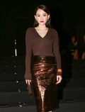 中国鞋网9月28日讯,陈乔恩应邀出席两个时尚秀,以代言品牌亚洲独家邀约女明星身份亮相,一向优雅甜美的她当天搭配气场十足的红唇和香槟色系眼妆,让人不禁感叹“教主”果然美貌过人。陈乔恩身着深V领针织衫搭配金色高腰裙,性感又不失新意,而左手腕处的金色手镯和同色系的手拿包交相辉映,更是优... -