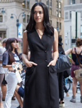 中国鞋网9月17日讯,姚晨亮相纽约时装周,一身黑色的西装马甲过膝裙配同色西装长裤,将当下最潮的穿搭方式展现的恰到好处,而简练服帖的裁剪又将其身材曲线衬托的凹凸有致,黄金比例的修长美腿甚为吸睛。整套服装看似硬朗的设计反而强化了姚晨的优雅与性感,帅气时髦、气场十足。这种源于60年代的裙... -