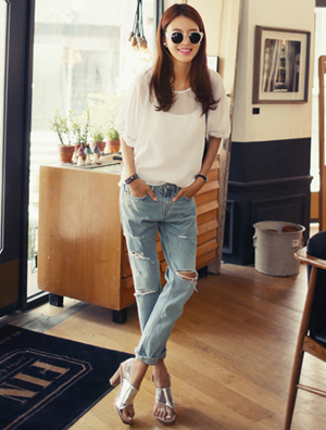 中国鞋网7月14日讯,夏季最简单的就是T恤或衬衣与牛仔裤的搭配,这是最常见也是最经典的一套搭配,怎么能穿出不同的感觉呢!答案就是好好利用小配饰,高跟鞋、肩包、墨镜、手链......给整体来了个大转弯,使原本有点单调、普通的牛仔LOOK立马升级,展现一种青春活力的感觉。 宽松舒适的V领罩衫,... -