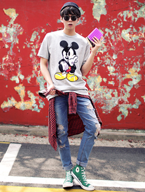 中国鞋网4月14日讯,对于男生来说,T恤是表达态度的有利武器!一件抢眼的T恤搭配低调的裤装和潮味十足的鞋子,就能轻松打造春夏潮流Look,也展现出了耳目一新的“FastFashion”。下面,让街头潮人示范教你怎么把“FastFashion”穿上身,一起引领春夏型潮! 水洗米奇T恤,微微修身的版型,领口和袖... -