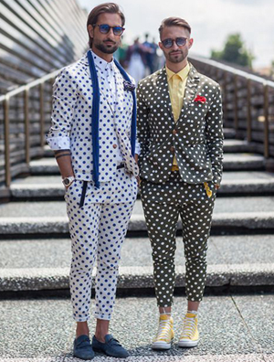 中国鞋网6月9日讯,成熟男士偶尔重返童心,穿上波点,风情俏皮。作为时尚又有点诙谐的元素,波点总能带给人快乐的感觉,也难怪如此受人喜爱。 两个蓄着胡须的成熟男士,穿上波点的西装套装,将正式与诙谐相结合,很有喜感,也很时尚。Stampd,约合人民币477元。Stampd,约合人民币1023元。Dolce... -