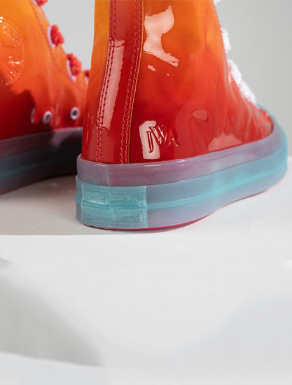 【-时尚资讯】上周刚刚迎来了JWAndersonxConverse“Grid”系列的发售,而海外地区同时发售了关注度极高的JWAndersonxConverse“Toy”系列。 这个Toy系列一共包含了4个单品,分别以高低帮鞋型呈现了漆皮光泽的亮丽装扮,独特的渐变色调,和光影效果非凡的漆皮反光,加上半透明的果冻鞋底,必定叫人爱... -