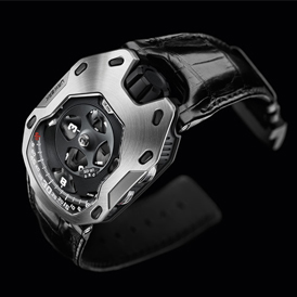 中国鞋网4月25日讯,以其标志性的卫星系统技术和EMC,UR-210,UR-110以及CC-1Cobra等经典型号而闻名的日内瓦腕表厂商Urwerk日前正式为最新款UR-105M腕表揭开面纱。53mm直径大小的钛合金外壳仅有16.65mm厚度,而以黑色呈现的卫星表盘上,通过底部的分钟刻度以及卫星盘底部的窗口来进行读数;此外腕表... -