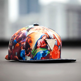 中国鞋网8月26日讯,照片图形印刷设计单品近期呈热门状态,包括这款HaterSnapback推出的Genesis帽款。将两幅宗教油画融入帽顶,对比度非常强烈的色调衬托出烂漫宗教艺术氛围;招牌金色倒三角金属铭牌展现街头奢华品味,帽檐则以鳄鱼皮细节衬托质感。喜欢浮夸艺术图形设计的朋友不要错过。... -