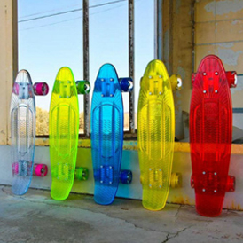 中国鞋网8月5日讯,美国滑板品牌sunset推出一组LED透明滑板,看到图片还以为是可以吃的糖果或者果冻!五彩颜色非常漂亮,板面注入透明材料,连轮子也是宽大的透明公路滑轮,在颠簸的路上也可以平稳行走,轮子里还安装了LED灯,靠轮子转动提供电力,有一万小时寿命。相比专业极限滑板,这种小鱼板非常...