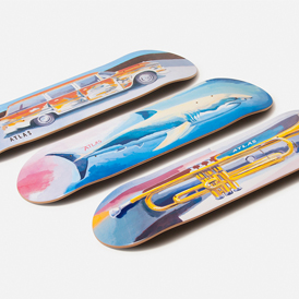 中国鞋网9月9日讯,美国街头艺术家BrianLotti日前与知名滑板店铺Atlas携手,为今年秋季打造了一系列联名单品。该系列一共包含了三块滑板和两款T-Shirt,设计上均是以BrianLotti标志性的涂鸦设计为主,并将鲨鱼、汽车和小号等涂鸦图案加印于滑板与T-Shirt之上,最后通过「ATLAS」的字样表明特殊身份... -