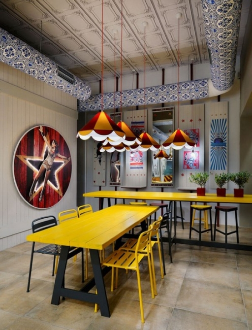 【中国鞋网-街头搜店】每次约会,男士都会头疼选什么样的餐厅能俘虏芳心,食物是其次,环境的氛围和设计才是重点,那绝对不能错过瑞典这家 Biribildu “马戏团”餐厅。室内设计师 Minas Kosmidis 把旋转木马、铁栅栏、表演女郎都融入餐厅,用餐环境被布置得色彩缤纷、充满趣味,就像身处一个游乐场和马戏团。在这样的环境进餐,绝对浪漫又充满乐趣,只是近看,回旋木马是厚板并非实体,略显省成本了一点。