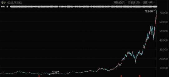 受益于销量的增长,李宁股价从3月以来也一路上行。5月7日上探至72.95元/股的高点,截至5月7日收盘,股价报68.5元/股,总市值超1700亿元。在3月9日至5月7日期间,李宁股价累计上涨达67.07%。