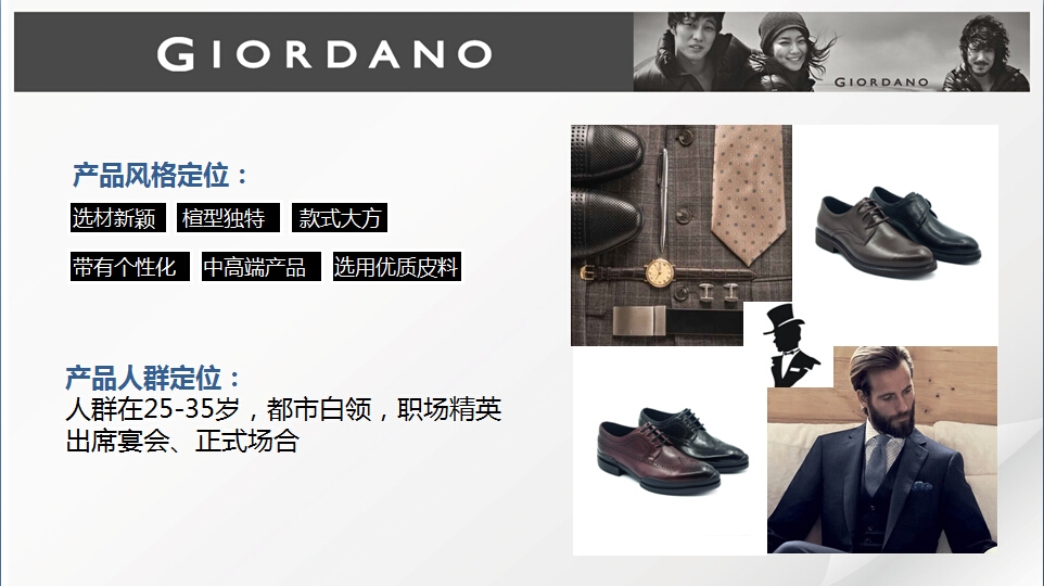 佐丹奴集团旗下品牌有: GIORDANO(佐丹奴服装) GIORDANO(佐丹奴休闲鞋) GIORDANO(佐丹奴休闲皮具) GIORDANO Ladies(佐丹奴女装) GIORDANO Junior(佐丹奴童装)GIORDANO Concepts one(佐丹奴男装概念店) GIORDANO BSX GIORDANO成立的宗旨,就是要提供给顾客贴心的感觉及穿出个人的风格,因此 GIORDANO提倡超越顾客期望,不只提供商品本身,更求由心出发,提供超越顾客期望的服务,让顾客称心如意。广州在和国际贸易有限公司系GIORDANO佐丹奴授权的鞋业中国总代理,公司是一家集产品开发、设计、研究、生产制造、市场营销为一体的专业化、系列化的品牌公司。公司总部座落于美丽花城——广州,总部实力雄厚,欢迎各位有志之士实地考察。 2015年佐丹奴鞋业总部首次面向国内市场敞开加盟,诚招加盟商。首创O2O加盟模式,开实体店送微商城!位列全球前三名的信息化系统,线上线下管控无忧!中国国家质量技术监督局认定为中国质量诚信企业。连续4年获得商界展关怀杯。产品风格定位: 商务、休闲、运动 1、商务:选材新颖、楦型独特、款式大方、带有个性化、中高端产品 2、休闲:无拘束、崇尚大众潮流、楦型选料及设计元素符合当季大众追求品位 3、运动:色彩明快、轻便、舒适、通过粗线条的轮廓设计与运动要素搭配,体现出张扬的时尚动感 休闲系列: 都市休闲 时尚教主 型格魅族商务系列: 男人帮 英伦风 运动系列: 时尚潮牌 韩风来袭 青春派对